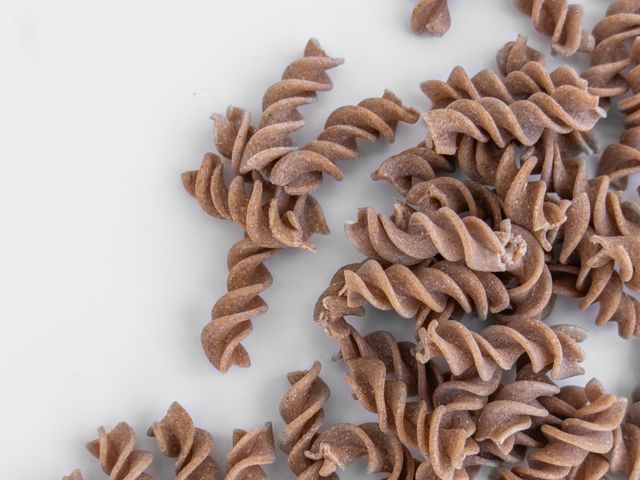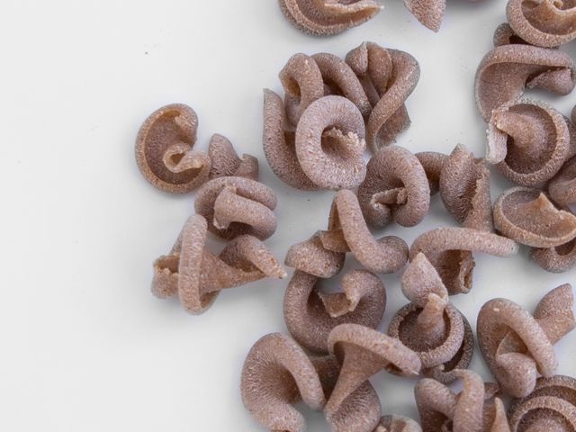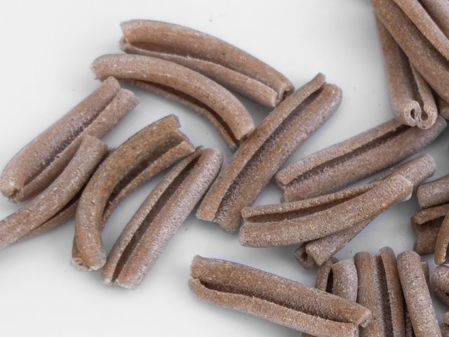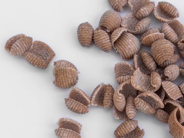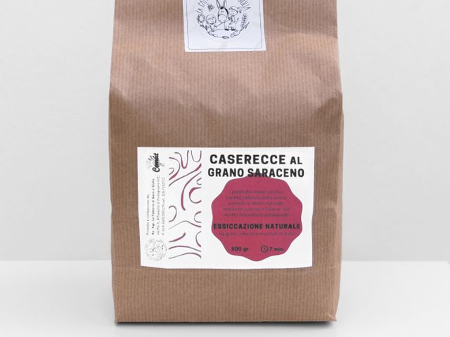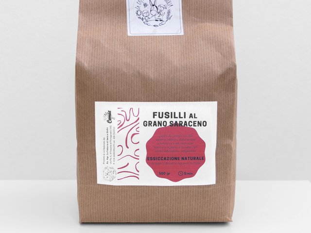 Confezione da 500 gr di pasta corta prodotta con farina di grano tenero, grano duro, grano saraceno.