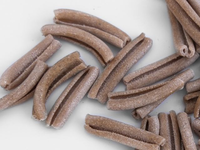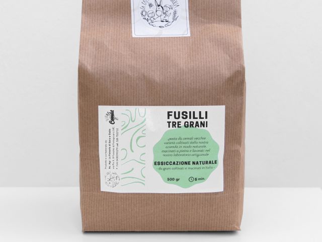 Confezione da 500 gr di pasta corta prodotta con farina ai 3 grani (40% grano duro, 30% grano tenero, 30% farro)
