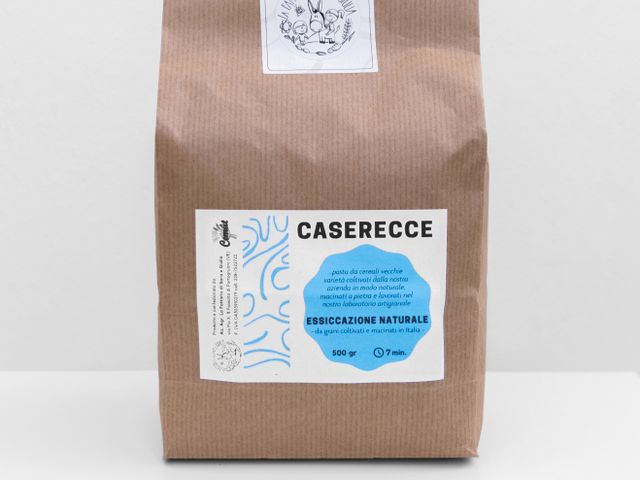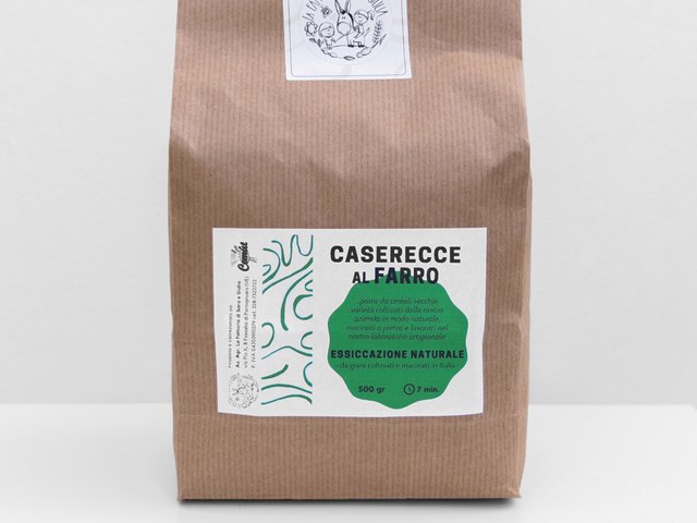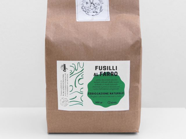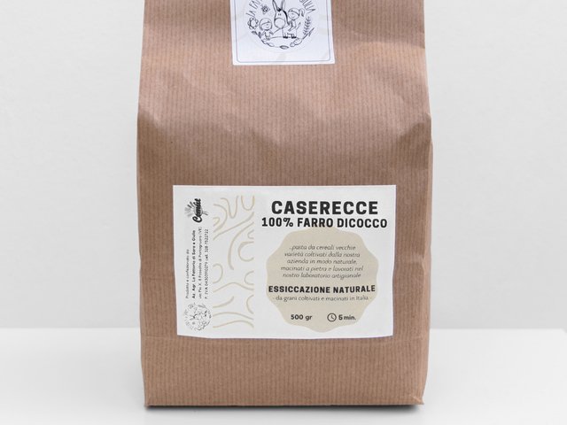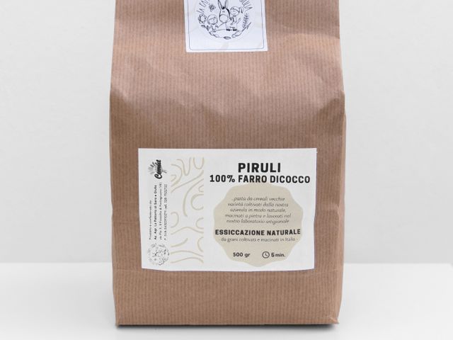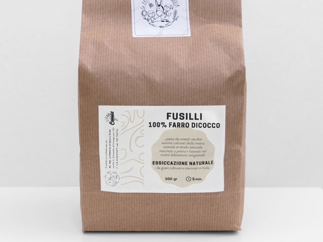 Confezione da 500 gr di pasta corta prodotta con farina di grano dicocco e grano duro.