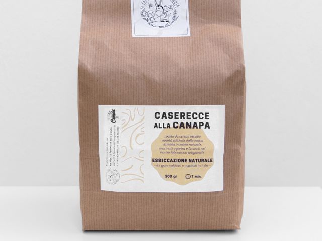 Confezione da 500 gr di pasta corta prodotta con farina T2 di grano tenero e farina di canapa (10%) da seme non spremuto.
